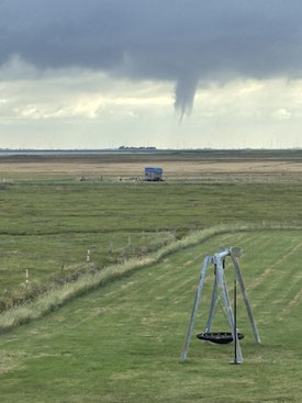 Heute konnten wir etwas äußerst spannendes beobachten: Direkt aus der Tür der Schule, mit Blick Richtung Dagebüll, haben wir einen Tornado gesehen. Während unserer Beobachtung hat er sich vollständig ausgebildet – mit einem klar erkennbaren Trichter, der bis zum Boden reichte.